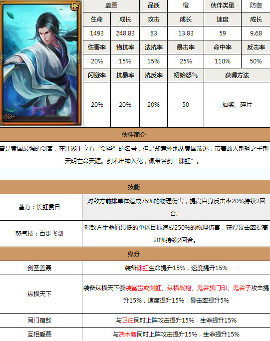 秦时明月盖聂就是一直保护小丁丁天明的大叔,天下第一剑客无人不知,无人不晓,话说当年盖聂和末庄一站,剑指其项,最后挥手一别,因为他相信,这个世界并不是师傅认为地那样。秦时明月盖聂小伙伴当然是和动漫中的一样出类拔萃!除了生来并存的百步飞剑绝技,这里的盖聂还独创了另一个绝技“嗜杀之刃”,杀人狂魔?