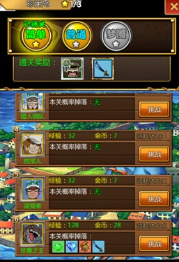 每个节点都有3种难度,玩家可以选择不同的难度进行攻击;难度越高,怪物难度越高,获得经验和金币也越多