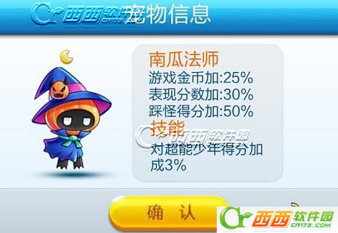 南瓜法师是天天酷跑最新推出的宠物,这家伙可是月亮级的宠物,技能属性也不错。昨天登录酷跑时无意间发现神马左边还有个南瓜头,一看吓尿了,9999钻石,然后一点神马就闪退了,进去就没南瓜了,只剩神马积分了。试了好几次,最后尼玛积分抽奖一看,7888计分兑换。