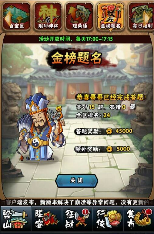 全民水浒是一款卡牌类手机游戏,最近游戏开启了金榜题名的玩法,玩家们参与金榜题名通过答题,就可以获取丰厚的奖励!那么,金榜题名的问题答案是什么呢?下面,来看小编为大家带来的详细介绍吧!