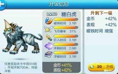 糖白虎技能:任意奖励关卡中得分4倍;开局冲刺700米;终极冲刺