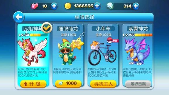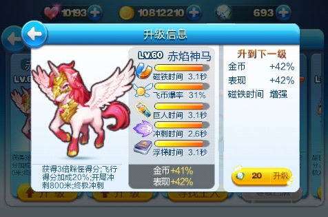 赤焰神马技能:获得3被踩怪得分;飞行得分加成20%;开局冲刺800米;终极冲刺