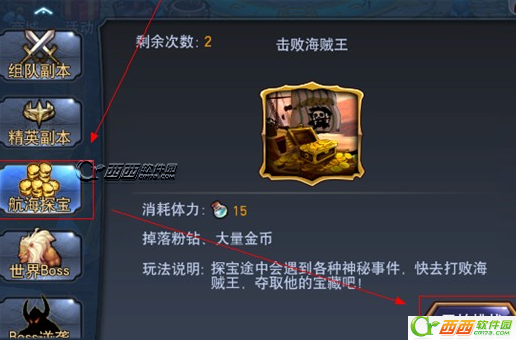 点击游戏主界面【副本】按钮进入玩法界面,玩法界面左侧选择【航海探宝】,点击【开始挑战】即可进入航海探宝玩法。前提是你又剩余次数