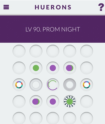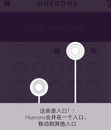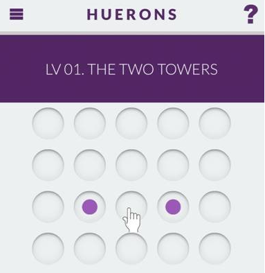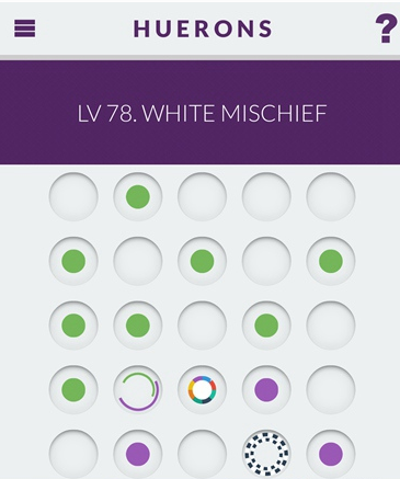 可是这点要在5*5的格子中实现一点也不容易,于是乎在游戏中有多达9种不同的 Huerons (就是游戏中格子里的不同圆点)。这些不同功能的 Huerons 有时会单独出现,也有结伴而来的。不过其中8种 Huerons (除了一开始就有的紫色和绿色的圆点之外),却是整个游戏最为重要的部分。