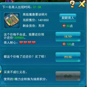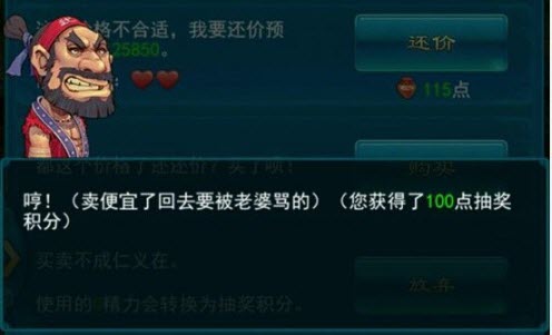 还价不如愿你也可以选择放弃交易,放弃交易后,还价成功所消耗的精力都会转成抽奖积分。注意放弃次数多了,神秘商人将不再和你交易哦!
