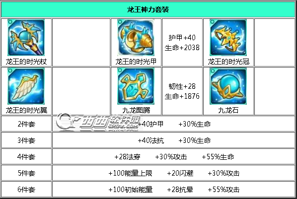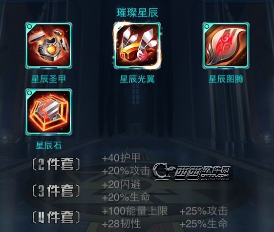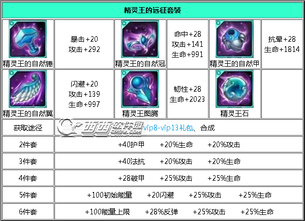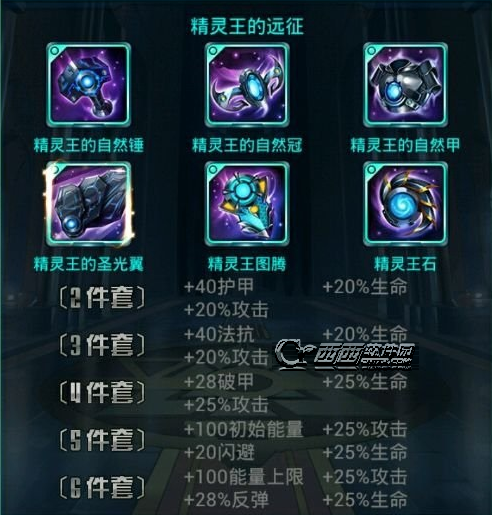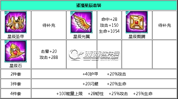 六星套装分别有精灵王的远征六件套、黑龙的意志两件套、龙王神力六件套、圣佑光环三件套、天使佑护三件套、璀璨星辰四件套。