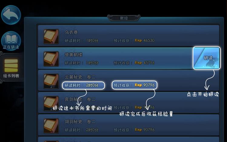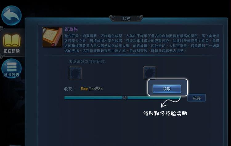 研读完毕后就可以领取全部的经验奖励了,当然了你也可以在中途来领取奖励,每个180秒即可领取一次,你可以分多次领,也可以最后一次领,总经验是一样的。