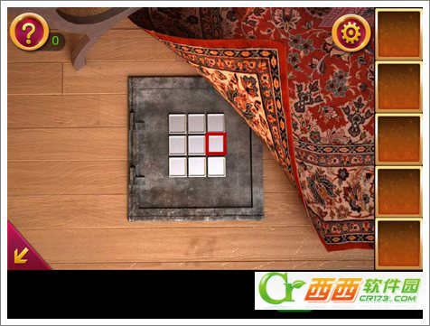 9.此时掀开地上的地毯,在地毯上可以看到一个密码器,先点击图中红色方框那个按钮,接下去每点击一个按钮下一个按钮就会发光(例如先点击红色,黄色格子发光,此时再点击黄色,另一个颜色又会发光,以此类推),按照顺序依次点过去即可,打开密码器就可以拿到钥匙的另一部分。