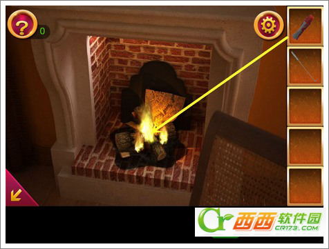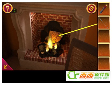 3.拿到蜡烛和铁棒后,点击壁炉,利用壁炉内的火焰把蜡烛点着。然后壁炉内有桌子上圆盘的一部分,用铁棒将其勾出来。