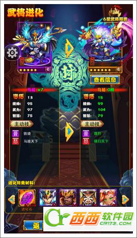 1、新增武将进化系统,主角等级达到75级开启,可以将+7的紫色武将进化成橙色武将,武将进化需要消耗若干个紫色武将及进化石,紫色武将和进化石可在普通副本、神秘商人、占星、竞技场、试练塔和军团组队副本中获得。