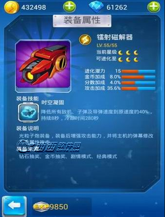 镭射磁解器为光粒子炮装备,装备后可以增强战机攻击能力。镭射磁解器在攻击力,分数金币等方面的加成上也有不俗的表现,且可通过副本掉落,商城购买,抽奖等渠道获得,是可轻松入手又实力强劲的性价比装备。
