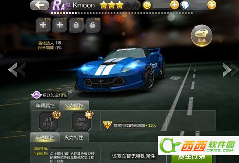 天天飞车kmoon尖峰时刻就是指这辆赛车的技能,每次通过加油站获得持续12秒的提升,惊险超车积分20%(初始状态),这辆赛车除了这个技能之外,还有一个火力技能,那就是隐匿持续时间增加0.8秒的火力特性,是不是非常给力呢?现在我们一起来看下其他的一些信息。