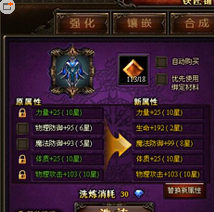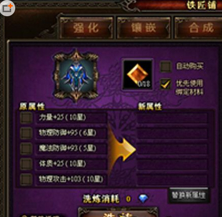 大家注意原属性下面的五个框,这五个框就是我们洗练强大属性的主要功能-属性锁定。