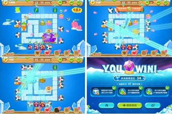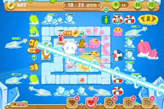 在游戏过程中,先在怪物出口处右侧安装玩具飞机塔,选择清除中间的红雪糕道具,并兼顾消灭来袭怪物。清除中间红色大雪糕后可获得4个便便塔,建议换装章鱼塔,并在清除其它道具后多安装一些章鱼塔,有利于尽早完成第二个额外任务。
