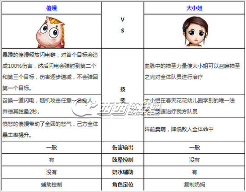 从两个角色的技能上来看,傻馒属于控制增益型辅助,还有一个伤害技能;大小姐就是属于正统的奶妈辅助,还多了一个让敌人减少命中的技能。两个角色从技能比较可以说是各有各的特点,喜欢暴力一些的就用傻馒,喜欢加血的就选择大小姐吧。