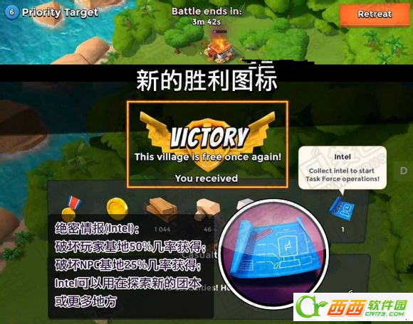 - 防守的时候根据摧毁部队数量,来确定获得intel对应数量,通过防御获得一颗钻即可获得一个intel,获得七颗钻(一次防御获钻的上线)可获得两个intel。被同一个玩家反复进攻送钻能否重复获得intel暂时未知;