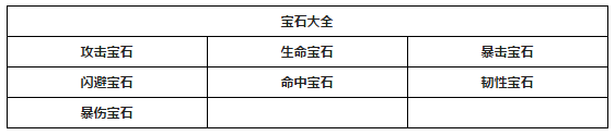 宝石一共分为七种分别为:攻击宝石、生命宝石、暴击宝石、闪避宝石、命中宝石、韧性宝石、暴伤宝石!