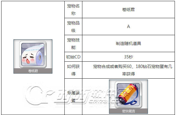 卷纸君的技能是制造随机道具,从这点就能够看出这个角色的实用性,也就是说个各种护盾、磁铁漫天飞,让玩家根本停不下来,总的来说,这个宠物实用性非常高。