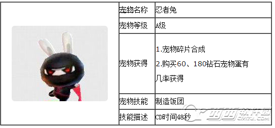 忍者兔获得方式:可以集齐20个相应宠物碎片合成,也可以花费60个或者180个钻石购买宠物蛋进行孵化,至于哪个能孵出来的概率更大不用我说大家也知道。