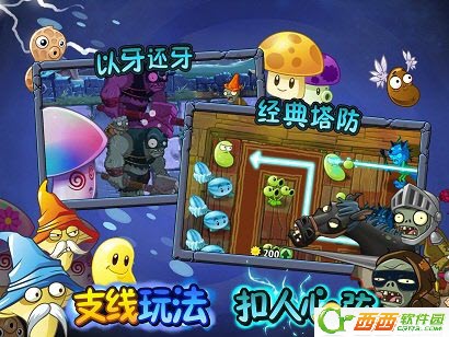 夜之黑幕缓缓降临,属于僵尸的舞台正式开场!《植物大战僵尸2黑暗世界》中的丑萌军团再次换装,升级技能让你不得不头疼!盗贼僵尸心机爆棚,走着走着就进入了隐形状态;举着蓝色魔法权杖的大法师僵尸,几句咒语就可以让植物大军缴械沉睡;驾着高马的骑兵僵尸更具备强大攻击力,不但将下马冲锋直捣黄龙,身下的战马也会来捣蛋,玩家精心栽种的植物一不小心就会变成了腹中粮草……植物与僵尸,谁赢谁输,黑暗世界里即将揭晓答案!