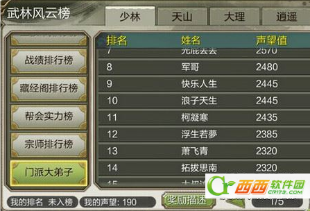 进入风云榜,然后点击门派大弟子,就可以看见声望值的排名,也可以看见自己的声望值。