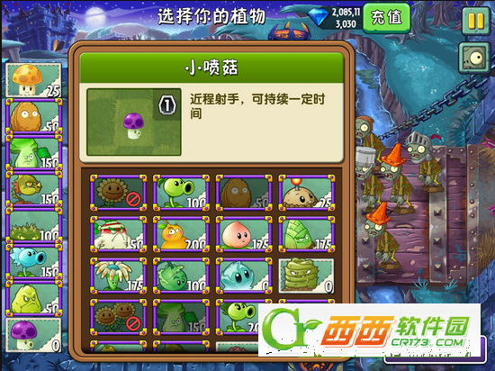 开始的时候先种一排阳光菇,然后不停用小喷菇来清理中场的墓碑来获得阳光。接着当出现了第一只僵尸的时候用坚果挡住,然后用火龙草来清掉前面的僵尸。