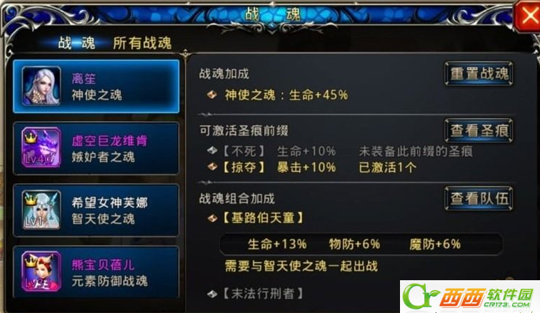 如图:希望女神的战魂是:智天使。而人物的战魂是:神使之魂。 这2个的组合加成是:生命13% 物防6% 魔