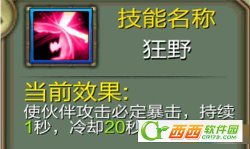 必定暴击的宠物技能。而且等级越高,持续时间越久,对于动物型伙伴来说,这个技能简直是神技。动物伙伴的伤害有时候比角色还高有木有!绝对值得你拥有的一个技能!