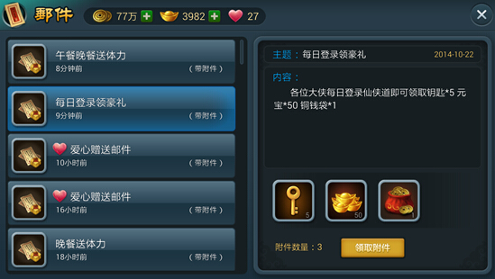 随着关卡难度的增加,开启城镇需要的光明钥匙也越多,除了上述的光明钥匙获得方法外,官方还推出了一系列的活动来帮助玩家获取光明钥匙。每日登录领豪礼的活动中,玩家每日登录仙侠道即可领取2枚钥匙、50锭元宝、一个铜钱袋。每日附件有效期至24点,记得及时领取!