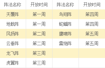 玩家可从“任务-副本”进入选择相应的阵法进行挑战,每周维护后更换两种阵法,各周开放阵法分别为: