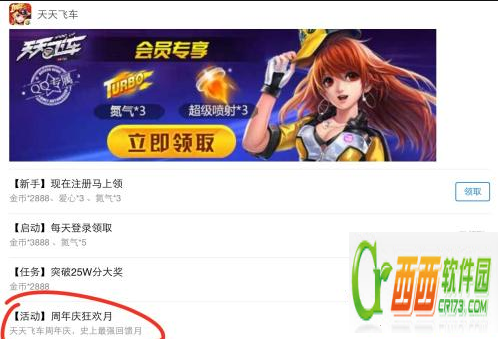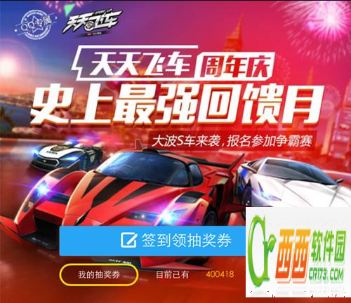 3、这里我们下拉找到“天天飞车”板块,其中最后一项“天天飞车周年庆”即为本次抽奖券互动啦,点击进入即会显示如下画面。快领取当日的抽奖券碰运气吧!