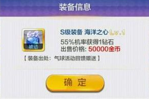 小编点评:虽然钻石是个高大上的东西,但这个装备只能获得1个钻石,还是几率获得,有点说不过去吧。随便跑跑得奖励也有5砖石啊。
