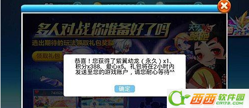紫翼幼龙永久1个,积分388个,爱心5个,礼包将在2小时内发送到邮箱里,大家登陆游戏就可以看到礼包了。