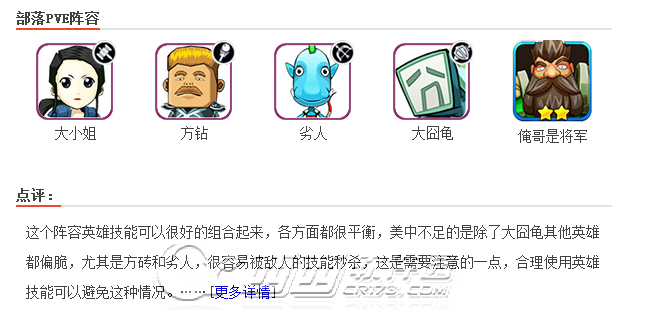 阵容解析:乌龟前排防御,俺哥是将军、呆贼、劣人输出,大小姐治疗。乌龟独自抗所有伤害,前2轮保障队友生存,有效保护队伍的后排。之后依靠前2轮劣人和呆贼强力打击秒杀脆皮,快速削弱对手实力,而大小姐能确保队伍的持续作战能力。此阵容为物理秒杀阵容,缺点在于战斗时间过长,在大小姐治疗空白时期容易减员。