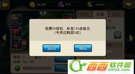 ⑤.【体力购买】玩家在游戏中经常会碰到今天差一点点经验就可以升级并且开启下一个副本组的时机,这个时候大大姐建议大家可以尝试购买体力,50符石即可获得120体力,同时VIP等级越高可购买的体力管数也越多。