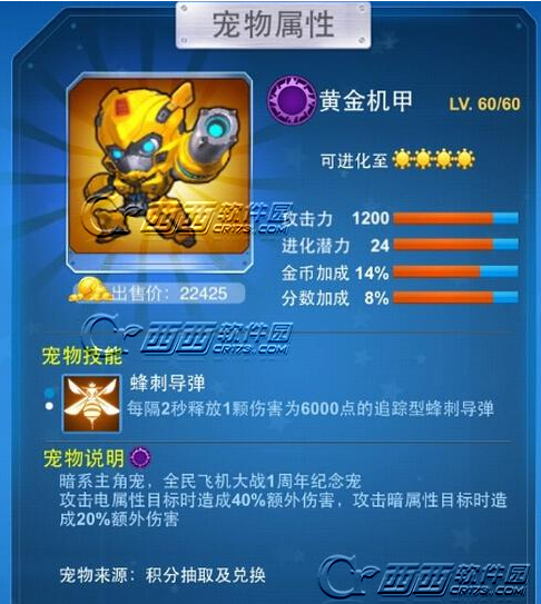 宠物说明:暗系主角宠,全民飞机大战1周年纪念宠,攻击电属性目前时造成40%额外伤害,攻击暗属性目标时造成20%额外伤害!