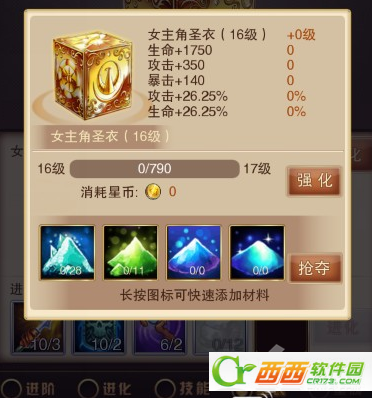 圣衣进化需要消耗一定量高级材料,可通过精英副本获得。每次升级可增加一个新的圣衣属性,升级后圣衣属性提高。