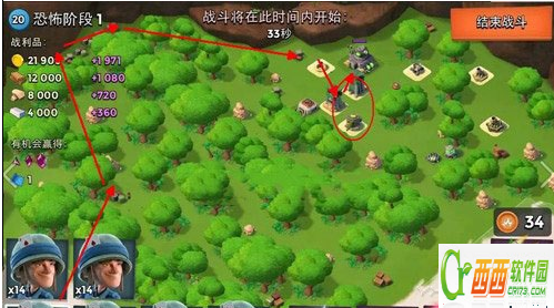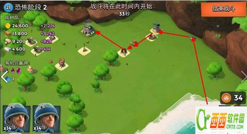 按照路线直接打就可以了,so easy!这些建筑防御等级都不是很高,感觉有点类似以前的第一关,只要从右边开始平推就OK啦~