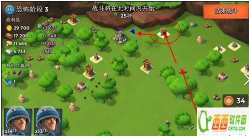 这一关低本的同学不要想用野人通关了,换兵吧,野人和步兵都不行,除非你的本等级高。坦克和妹妹都可以卡射程,具体的方法如下,在右侧登陆之后,走到那个红圈的位置就可以直接卡射程撸了。一定要注意好走位,最好打之前先看一下菊花炮的射程哦!