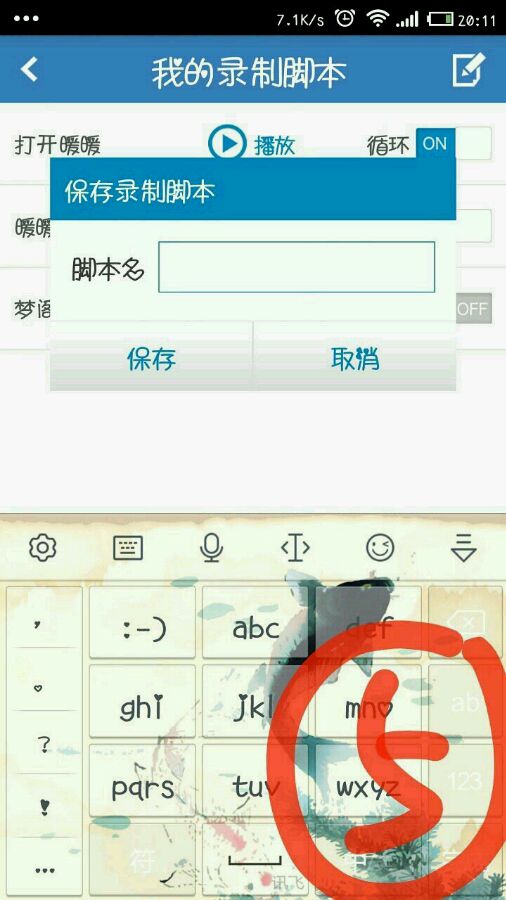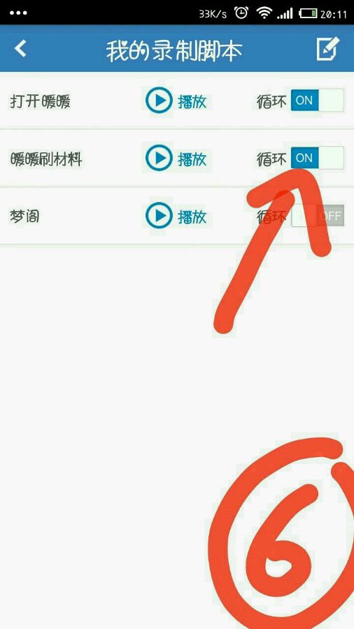 ⑥保存好脚本名,打开箭头所指的循环开关,然后点击播放。