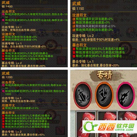 共包含兵器技、灵兽技、普通攻击、技能X6个(每职业6个技能)单职业共9种暴击符文;