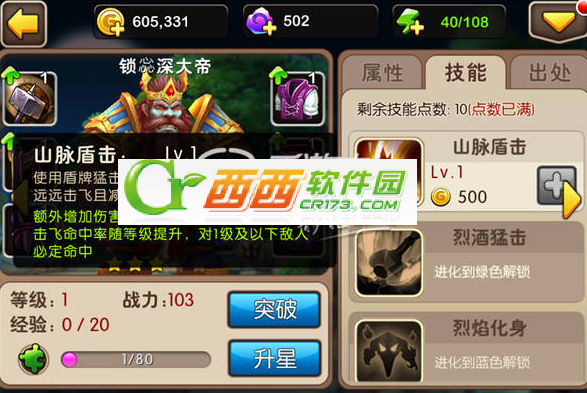 烈焰猛击:起手技能,起手就能对敌方前排单体造成大量伤害和持续性伤害,升级技能增加伤害;