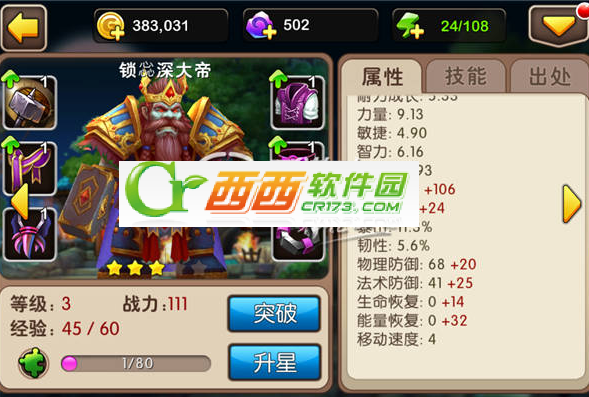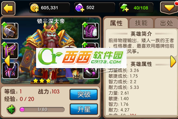 点评:作为一名初始3星的力量型英雄,3.26的力量成长显得有点寒酸,这导致锁惢深的基础攻击低,耐力成长是个亮点,5.33的成长值是目前同星级英雄中最高,生命值杠杠的。