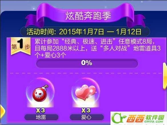 1.累计参加”经典、极速、进击“任意模式8局,且每局2888米以上,送”多人对战“地雷道具3个+爱心3个