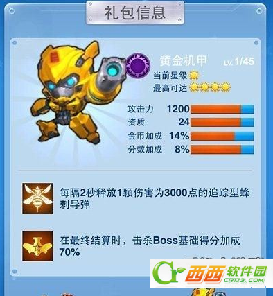 此前也有预测,太阳宠里面绝对会有加分宠的,这一次周年庆可谓是顺应民意而出。黄金机甲的满级属性和其他太阳宠一致,弹道为源源不断的金黄色双月牙形飞刀,整体色调与阿波罗非常相衬。追踪导弹和加分两大技能很好地弥补了阿波罗弹道比较集中,且得分加成较小的不足,同时也满足了太阳宠中暂无加分宠的遗憾。