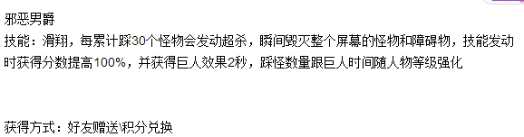 技能:滑翔,每累计踩30个怪物会发动超杀,瞬间毁灭整个屏幕的怪物和障碍物,技能发动时获得分数提高100%,并获得巨人效果2秒,踩怪数量跟巨人时间随人物等级强化