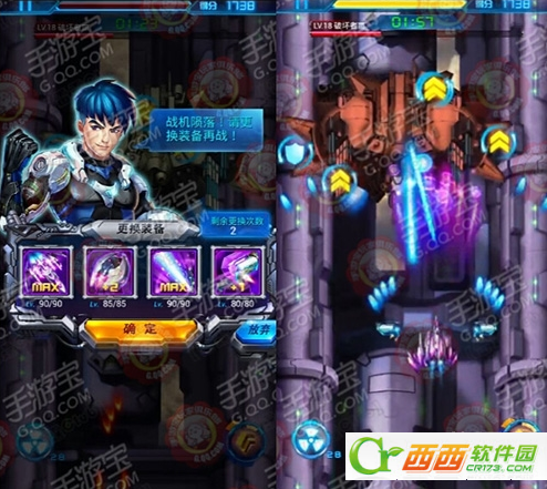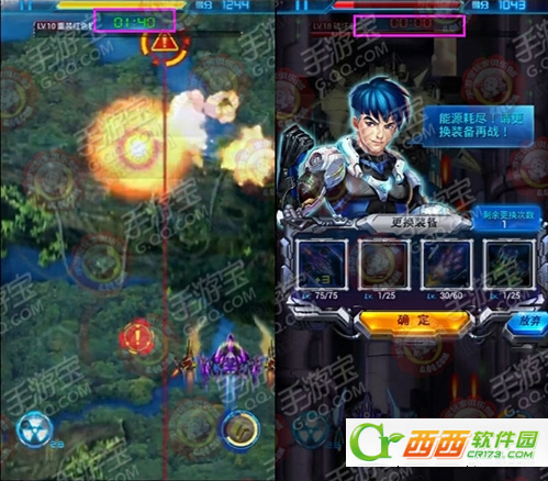 在每局游戏中,一套装备(战机+装甲+副武器+僚机)使用时间限制为2分钟,时间到或者被攻击后血量掉为0的时候该套装备燃料耗尽,弹出更换装备界面,同时第一套使用的装备灰化,不可再次使用。