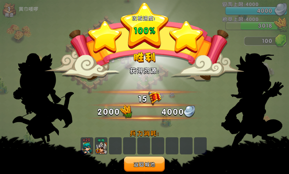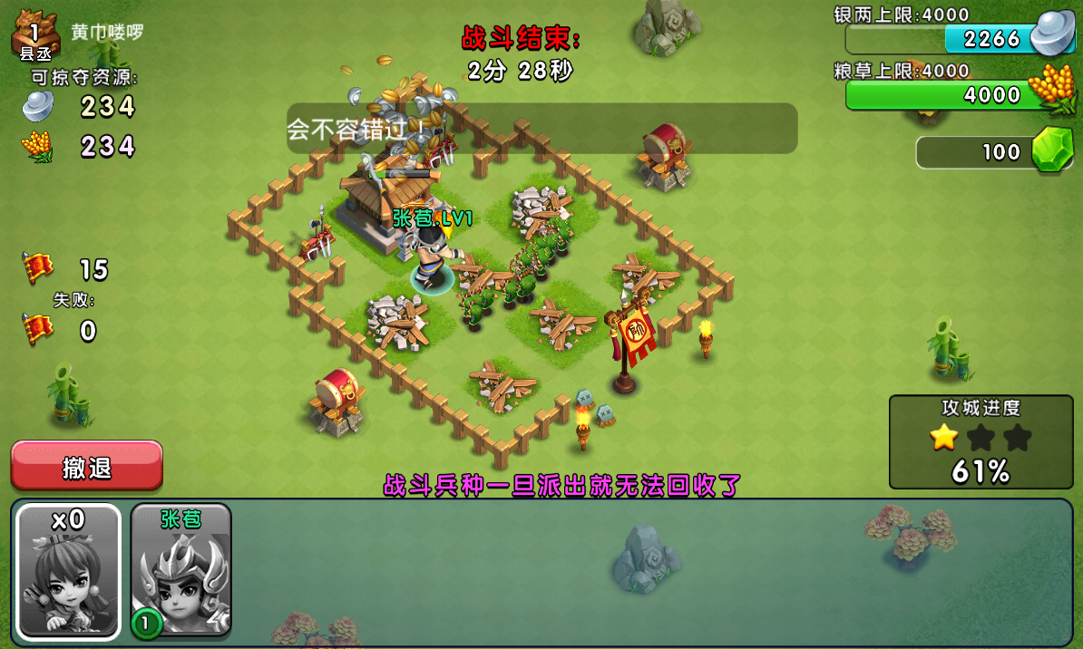 配合升级后的粮田和矿场的资源收获,加上征战天下的三个难度、20余关卡的攻打征收会让你的资源非常丰厚,将是游戏中的一大部分收益的来源。