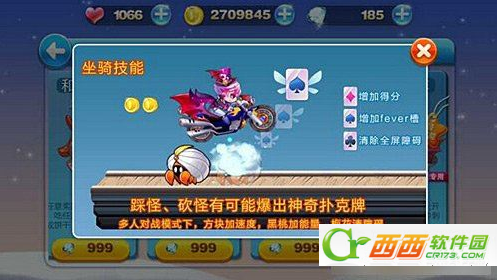 光看技能的话小编还会认为看到的是之前的捣蛋南瓜,它们之间的技能都非常的相似。在进击模式中相信魔神战车可以变幻成其他有坐骑技能的坐骑:冰锋狼王、流星狮爷、极地白熊。如果光是看技能,魔神战车确实不给力,但有隐藏的组合得分可能会帮助得高分。唯一值得期待的是踩怪爆出的神气扑克牌能有什么效果或者多少分,飞行得分对扑克牌有加成。