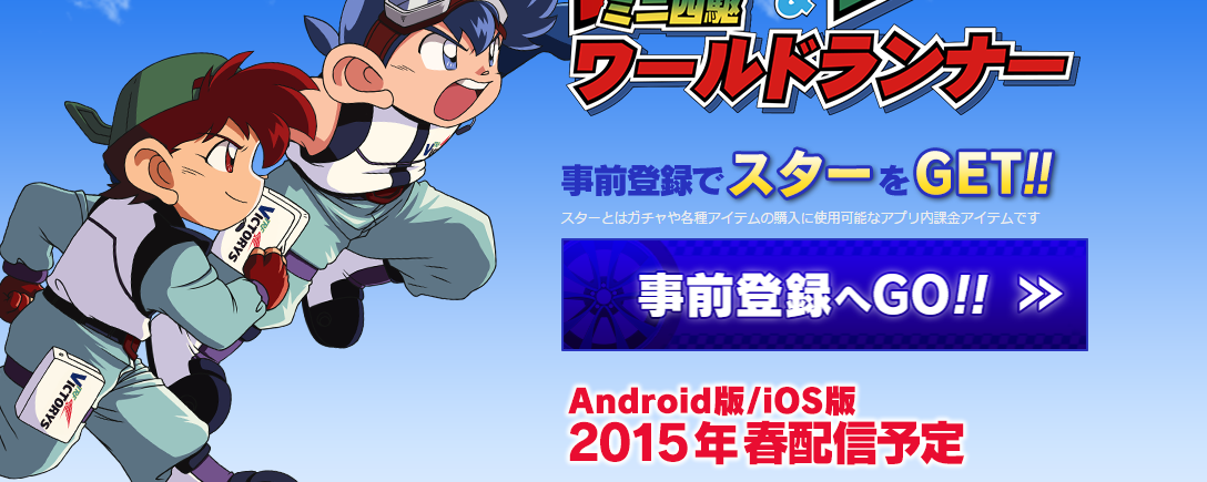 现在,四驱兄弟(日语:爆走兄弟レッツ&ゴー!!)的手游作品《四驱兄弟:迷你四驱世界车手》(爆走兄弟レッツ&ゴー!! ミニ四駆ワールドランナー)即将登场,现官网已开放预先注册,这是一款竞速游戏,世界中的车手聚集相互切磋对战。据悉,《四驱兄弟:迷你四驱世界车手》是由手游厂商Bushiroad打造的手游作品,但目前官方并没有公布关于游戏的任何消息。而游戏在今天起开始接受提前预约登记